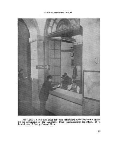 GUIDE TO PARLIAMENT HOUSE o K/ Post Office : A sub-post office has been established in the Parliament House for the convenience of the Members, Press Representatives and others. It is located near lift No. 5, Ground Floor.